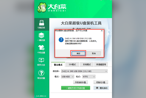 1下载并安装好大白菜装机版,打开软件并插入U盘,选择“默认模式”,点击需要制作启动的设备,在模式选项中选择“USB-HDD”,格式选择“NTFS”