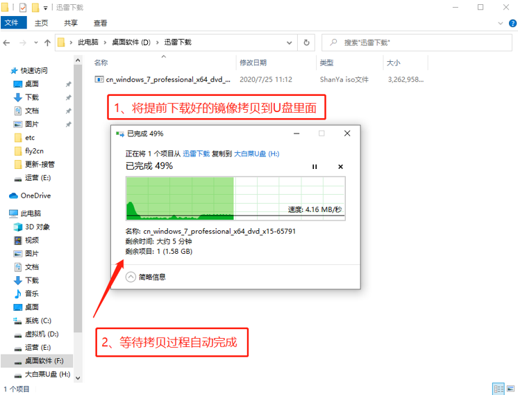 8下载完成后,找到下载好的WIN7 ISO/GHO镜像拷贝到U盘目录,由于ISO/GHO文件通常都比较大,可能需要等待5~10分钟